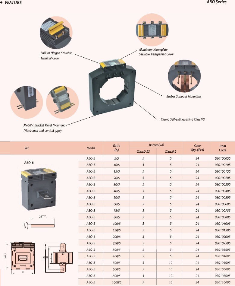 ABO Series (8 frames) perfect designed plastic case current transformer, advanced snap on body, high accuracy (up to Class 0.2S),