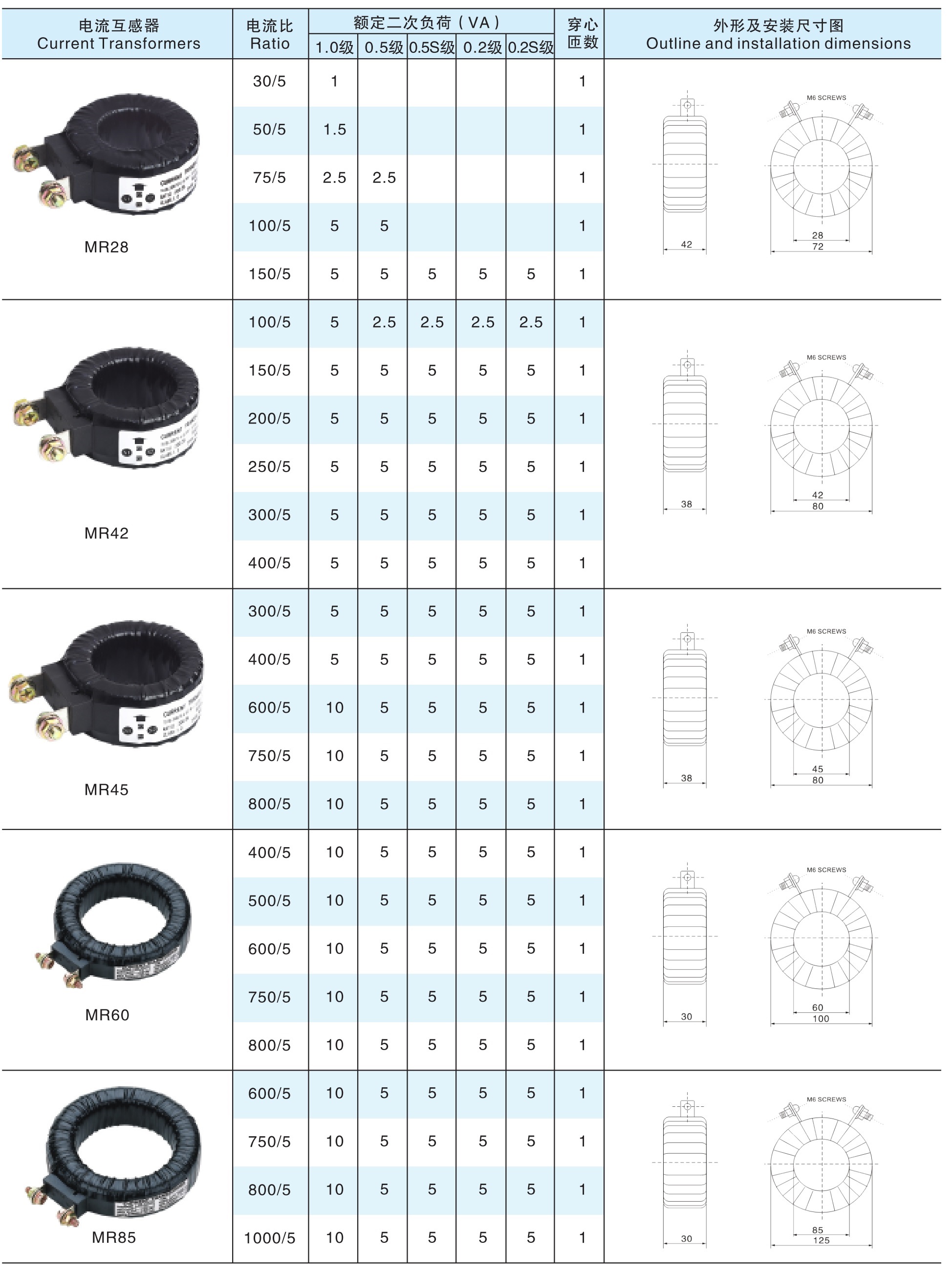 MR current transformer is a plastic enclosure, fully enclosed and indoor type.Suitable for power metering, current measurement and relay protection in power systems with rated frequency of 50HZ or 60HZ.The product conforms to IEC60044-1;2003 and GB1208-2006, current transformer & GT;Standard.The magnetic conductivity of MR current transformer is made of annealed ring core to ensure the accurate limit coefficient of product 5P5, 5P10 or 10P10.Ensure that the product is not saturated in a short circuit state, and effectively ensure the relay operation.